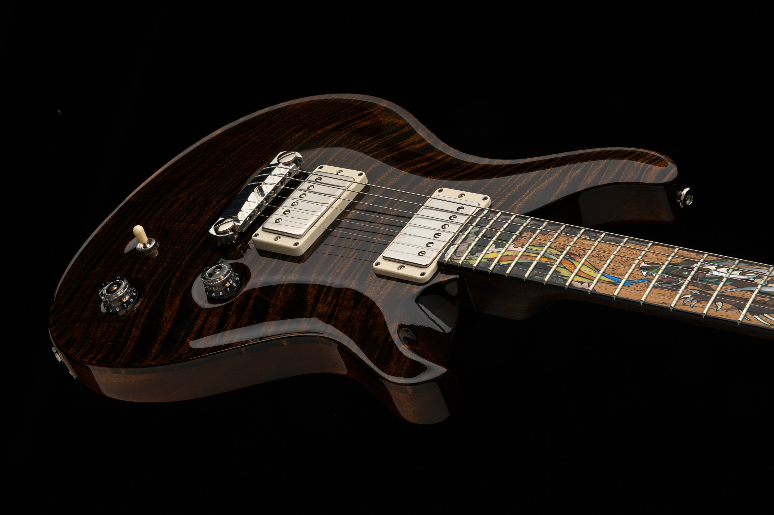 今回の40thドラゴンは、35thに続いて指板上にドラゴンの姿がインレイされるスタイルです。